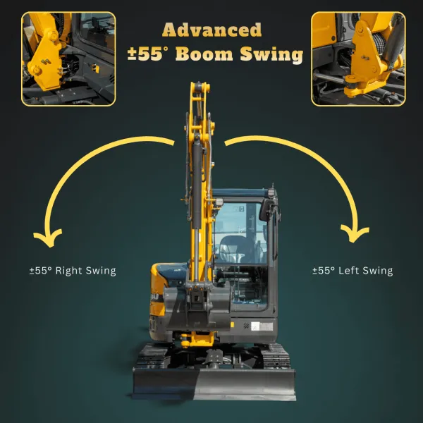 – Boom swing up to 55 degrees for working along walls and boundaries
