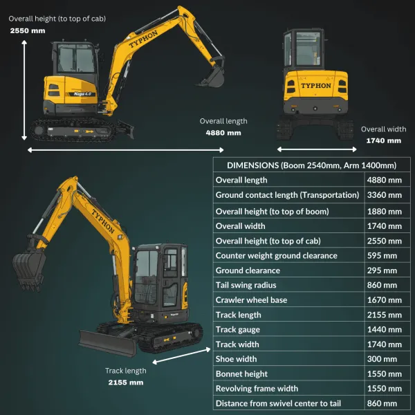 TYPHON NAGA 4.0 mini excavator is built for operators who want reliable control, clean digging, and a machine that fits the way real jobs flow. In the 4 ton class, the goal is simple: finish the trench, shape the grade, and move to the next task without fighting the controls. Powered by Yanmar 3TNV88F Diesel, this setup focuses on steady output, consistent response, and dependable day to day operation.